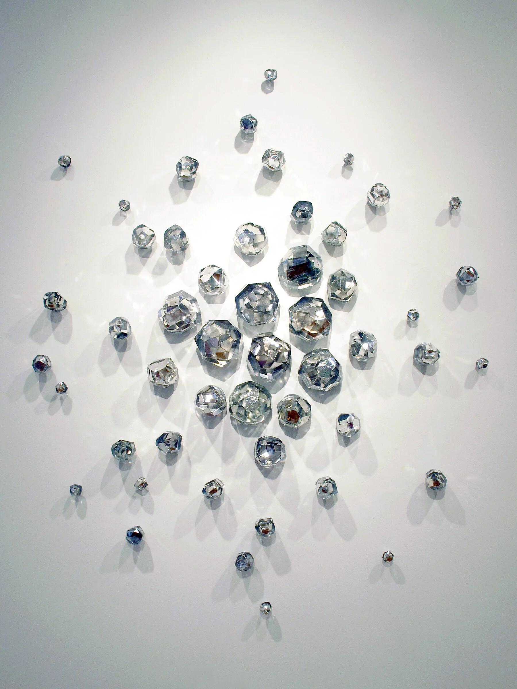 Joanna Manousis’ wall installations and assemblages made of cast and, recently also, blown glass are designed to draw the viewer into a state of reflection about growth, emotionality, aspiration and mortality – the essence of human existence. Often adopting forms reminiscent of a cathedral’s window and replacing the passive transmission of light with an optic reflectivity, she emphasizes the universality and interconnection between all of us.