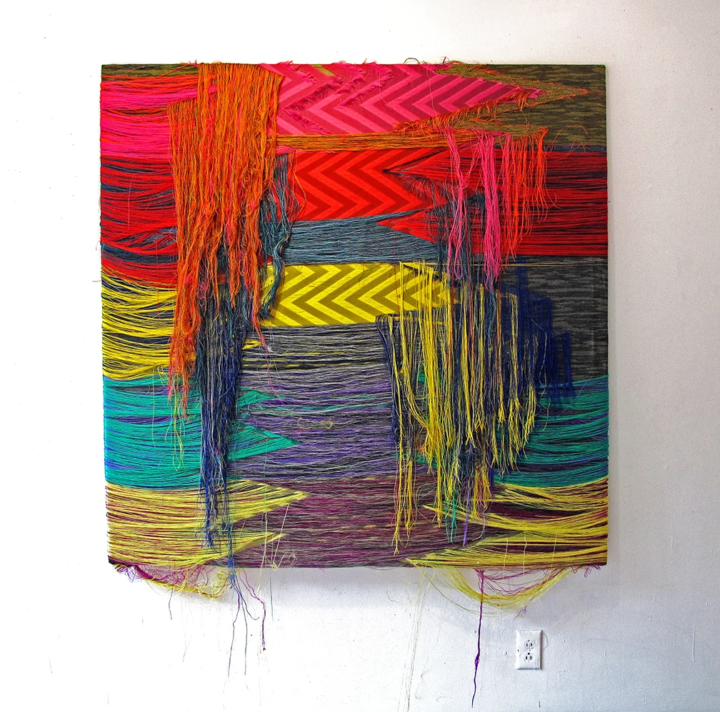 In both her artworks and her home textiles Collins uses the universal language of bold lines, repeated stripes and jagged lighting bolts in vivid colors. The hard-edged shapes act like the caution chevrons and zig zags on trucks or traffic signage that warn you to watch out. Layers of pattern assert themselves with explosive energy and create a deep clash of alluring sensuality. Everything is covered with pattern and the space is made to glow.