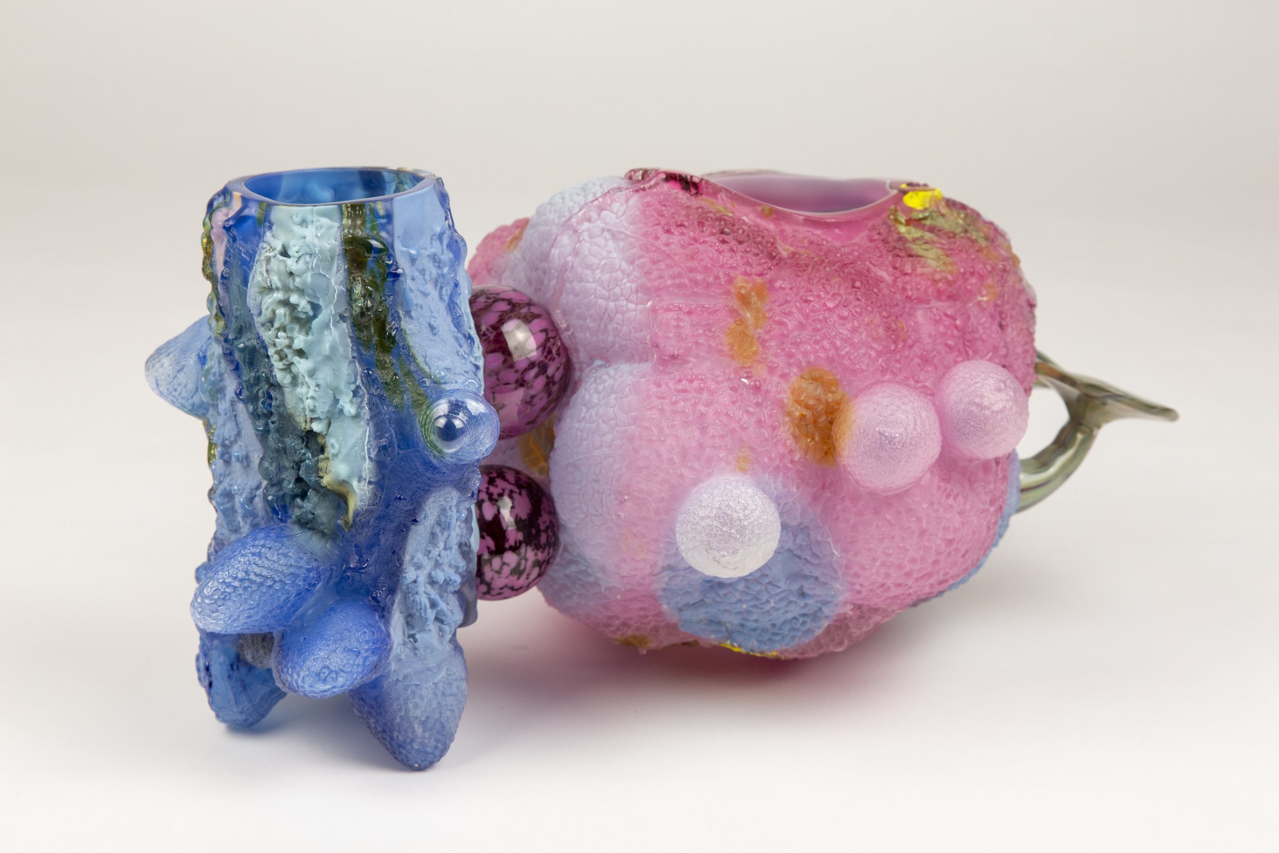 The duo’s exuberant, vessel-based forms take on the shape and surface structure of plants, fruits and vegetables, which they use to make their molds. While their pieces imprint as colorful, fresh and unconventional, and their sophisticated, labor-intensive process and skill level date-stamps their work, the two artists also channel a more essential creative freedom that recalls the early American Studio Glass practitioners’ exploration of glassblowing in the tumultuous Age of Aquarius.